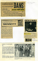JACKIE FOUNTAINS studio recording sessions: There were no less but eight different Jackie Fountains studio recordings sessions. The early studio recordings featuring Lasse Kjellström on lead vocals have got an explosive, raw beat/rnb/punk sound that is very similar to the The Namelosers. Later recordings with Bob are in a unique Jackie Fountains beat/rnb, mod-beat/rnb, and folk-beat style. Your Love is a killer Swedish beat/rnb raver with a super fast blistering leadguitar break by Hasse, and perhaps my favorite recording from the 2nd lineup with Bob. The earliest demos of the Jackie Fountains from 1965 were recorded by Sixten Albertus at a movie theatre in Södertälje called Biographen Grand. The owner, Sixten Albertus was also operating the Euphonic studio in Stockholm where all the Jackie Fountains tracks from Ake Söhr/Lars E. Carlsson's legendary Dollar label were recorded at. JACKIE FOUNTAINS recording session #1: